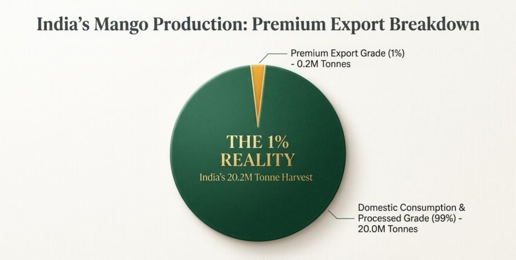 However, in agronomy, immense volume rarely equates to absolute perfection. Despite this staggering national output, a surprisingly small fraction—less than 1%—actually meets the rigorous, unyielding standards of premium, export-grade fruit. The vast majority of India’s 20-million-tonne harvest is treated as a commercial commodity, destined for local mass consumption, industrial pulping, purees, and concentrates.